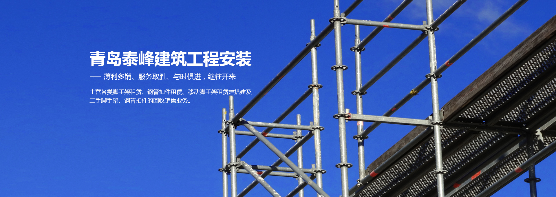 <p>青岛泰峰建筑工程安装有限公司主营各类脚手架租赁、钢管扣件租赁、移动脚手架租赁建搭建及二手脚手架、钢管扣件的回收销售业务。公司实力雄厚，拥有钢管约3000吨、扣件70万只、钢笆7万多片塔吊、人货电梯多台；总资产达到1000多万元。是一家具有脚手架搭建、水电安装专业承包施工资质的企业，并成为青岛市五金协会的会员单位。且多次参与高层建筑、建筑装修、玻璃幕墙、桥梁、隧道、地铁、电厂维修施工、造船等行业的施工，并获得施工单位的一致好评。 人无信不立，有信则强公司以“薄利多销、服务取胜”为经营宗旨...</p>